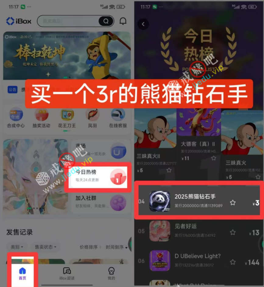 2.点首页的今日热榜买一个3块钱的钻石熊猫手。