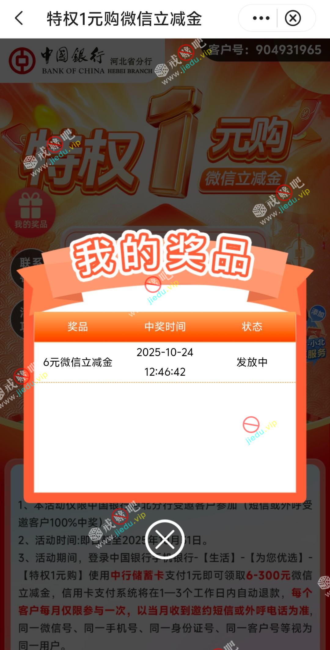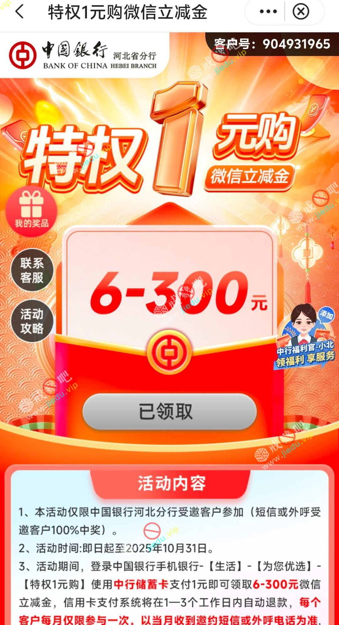 10月底前登录手机银行支付1元领取6-300元微信立减金,100%中奖!活动路径:手机银行-生活-为您优选-特权1元购
