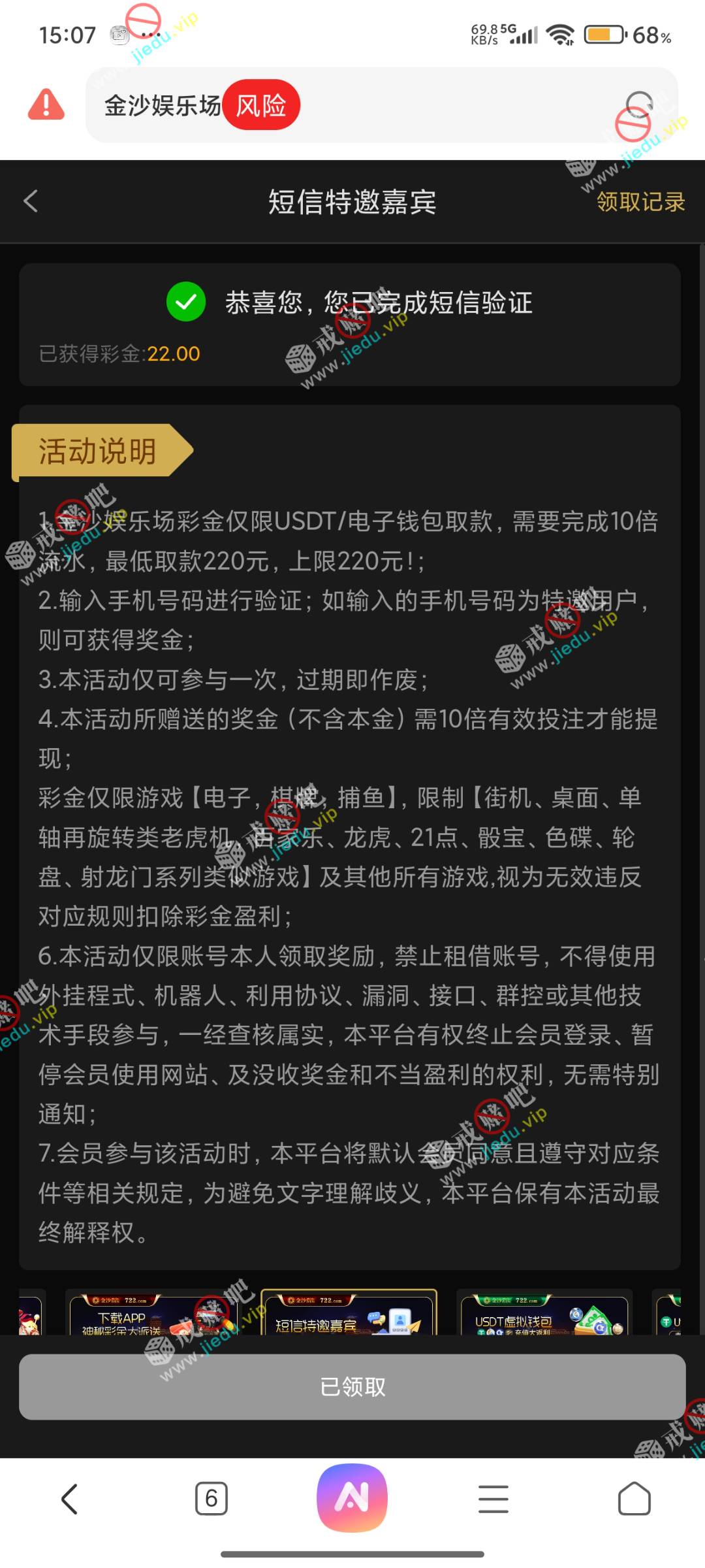 短信验证送22,限制出款220。我撸到了,大家可以试试,白嫖就好。