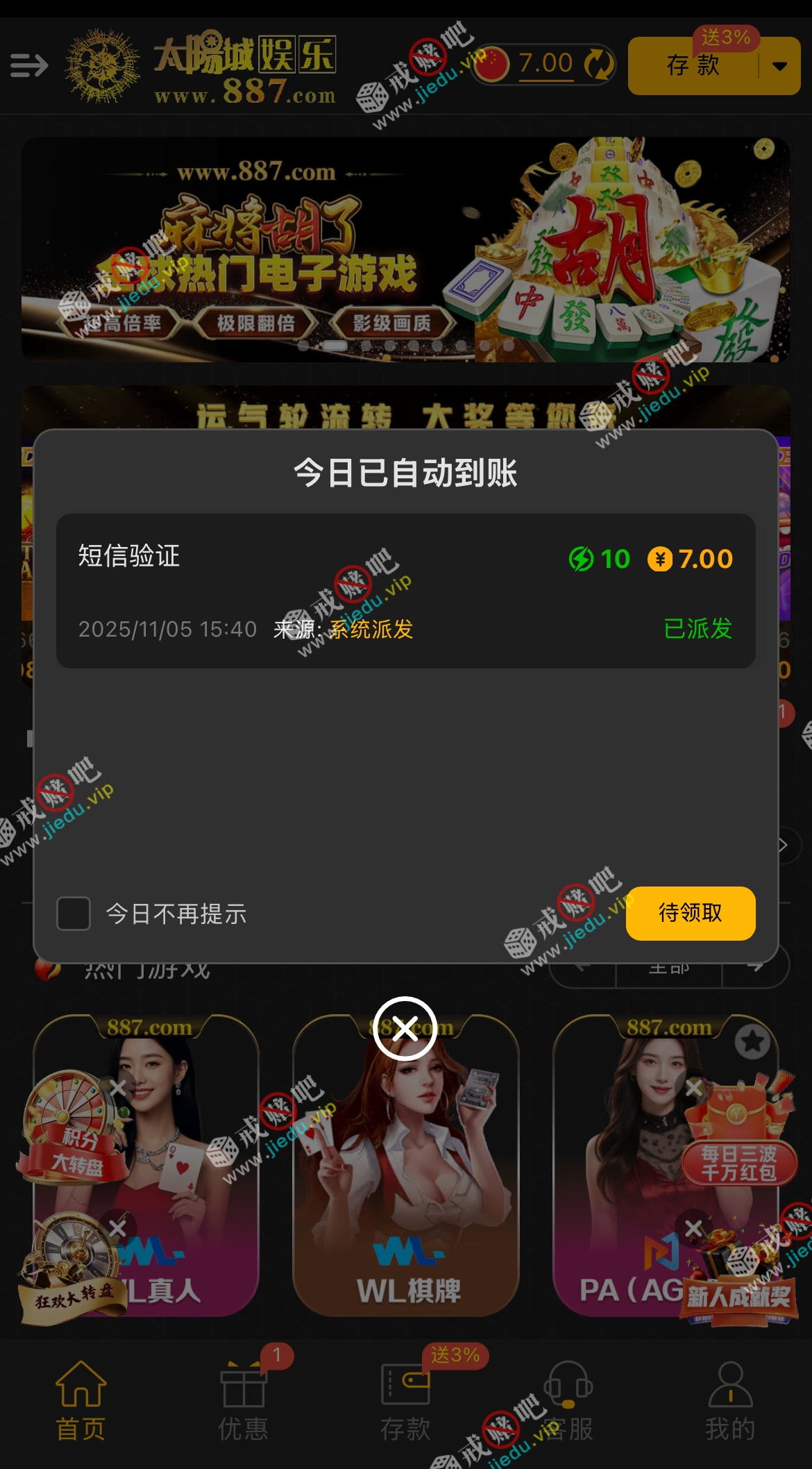 满100提,短信自助验证 7。