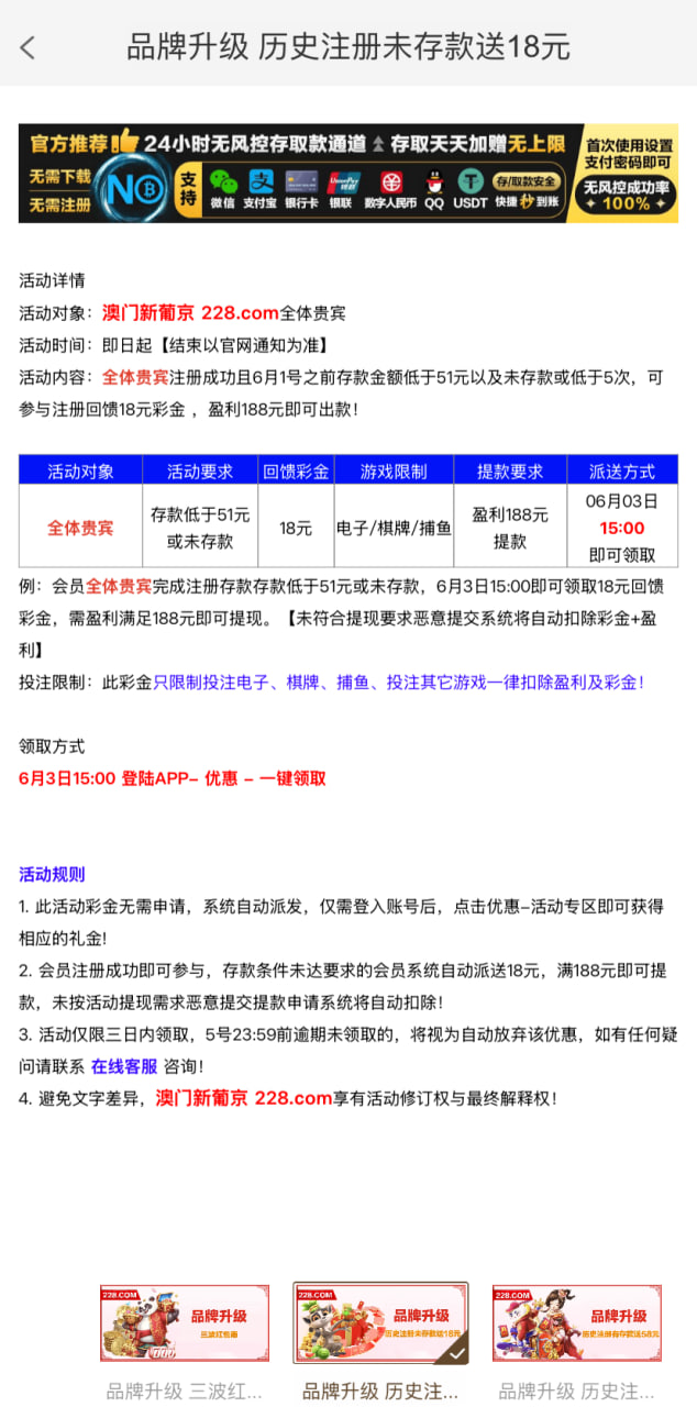 6.1号之前注册未充值的送18 充值5次大于51的送58 还有单笔充值彩金  有号的兄弟们上号自己看活动 6.3号下午15.00和16.00彩金优惠领取即可