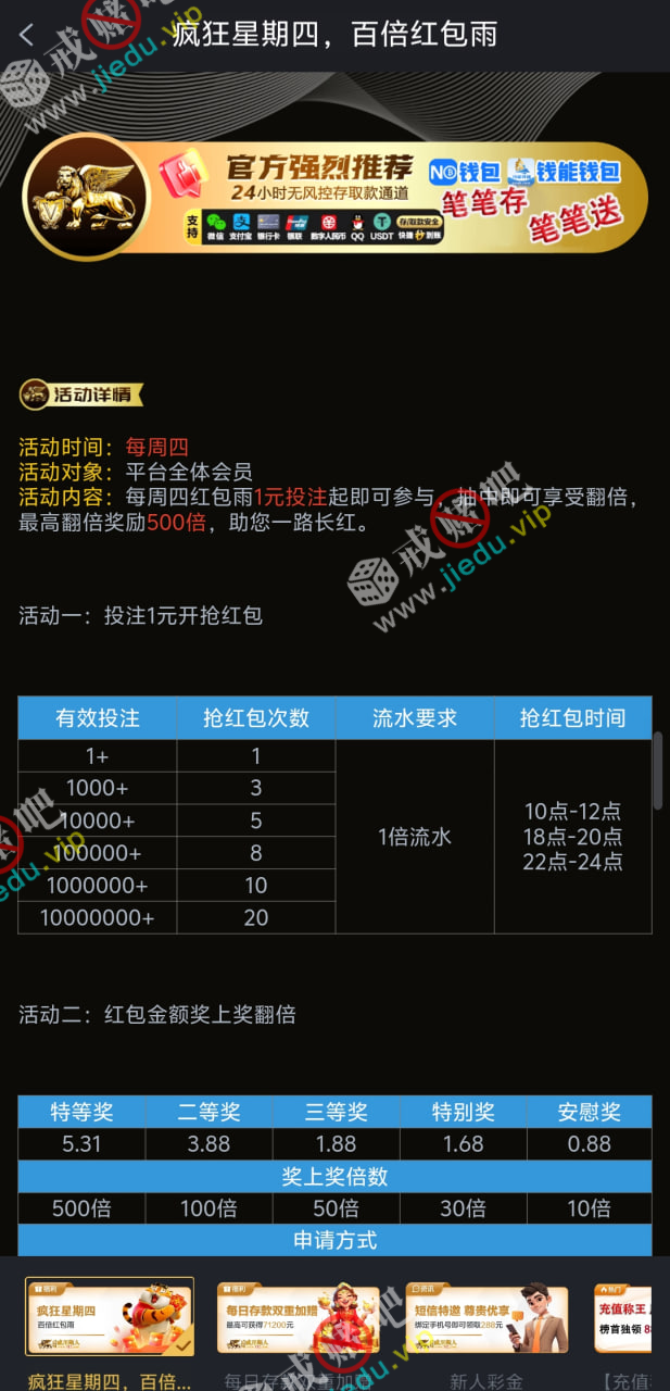 有账号的哥们活动是这样玩的,每周四只有投注一 块钱,就能参与加超级红包,下面有活动介绍,还有红包时间,中奖概率挺大的,这个月中了两次30。