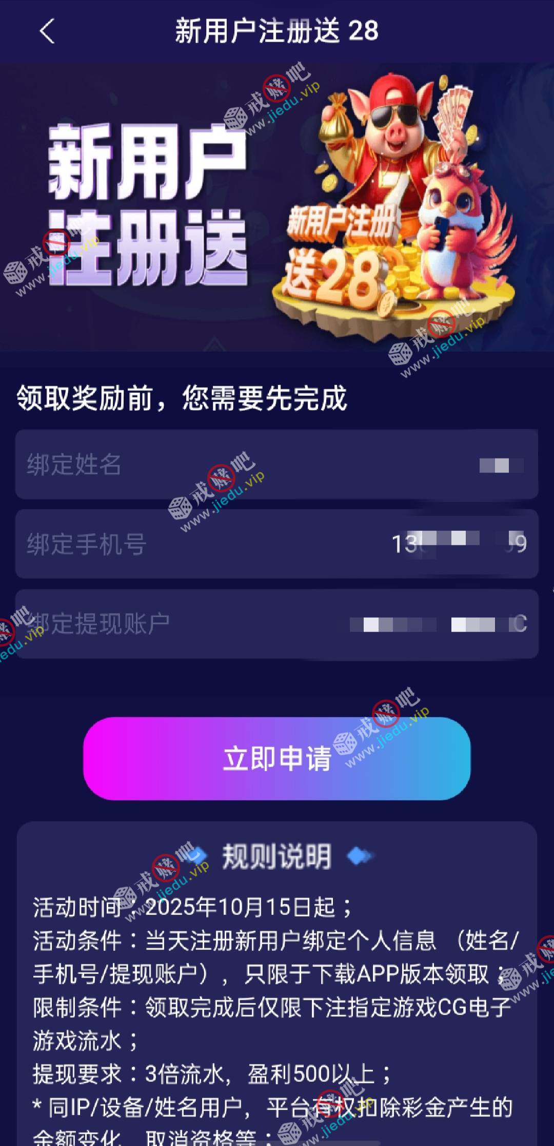 碰到道友了,当时奔着绑卡彩金去的下了一百,当时开始入坑的。本金就是那一百,新号放水那个月玩啥赢啥。后面又送回去了,不然当时都有苹果14了,最后祝兄弟早日上岸。