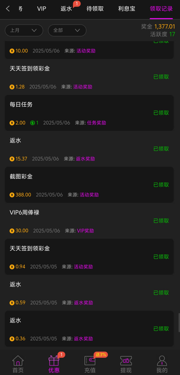 上个月充值达标的,明天6号记得去找客服申请下截图彩金,这个活动很隐秘,要不是我翻来翻去活动都没发现,我上个月领取了388彩金,然后出了一千,明天又可以领了。