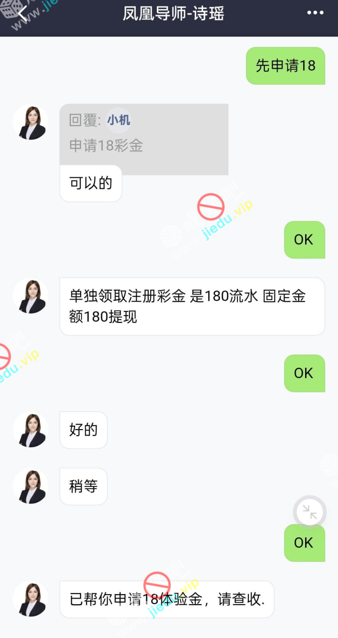 接到电话,注册后找专员领取申请 18 彩金,先申请 18。