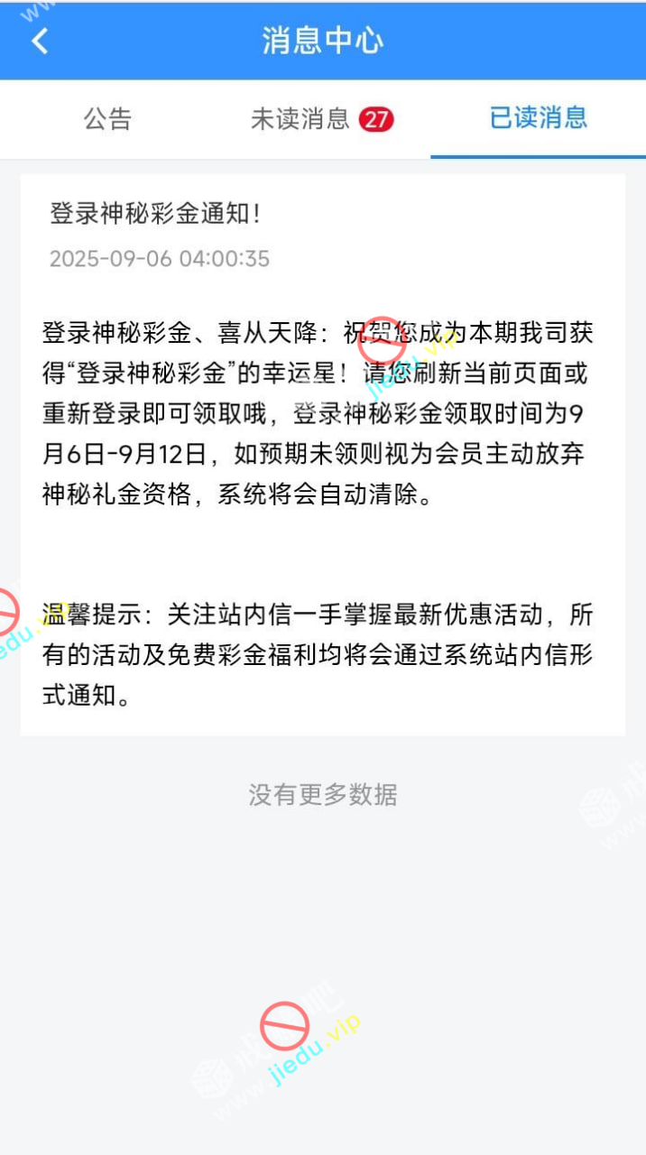 有号的哥们登录就看下消息中心,收到站内信神秘彩金的消息就自助领取,未领取就放弃了,去看看吧。