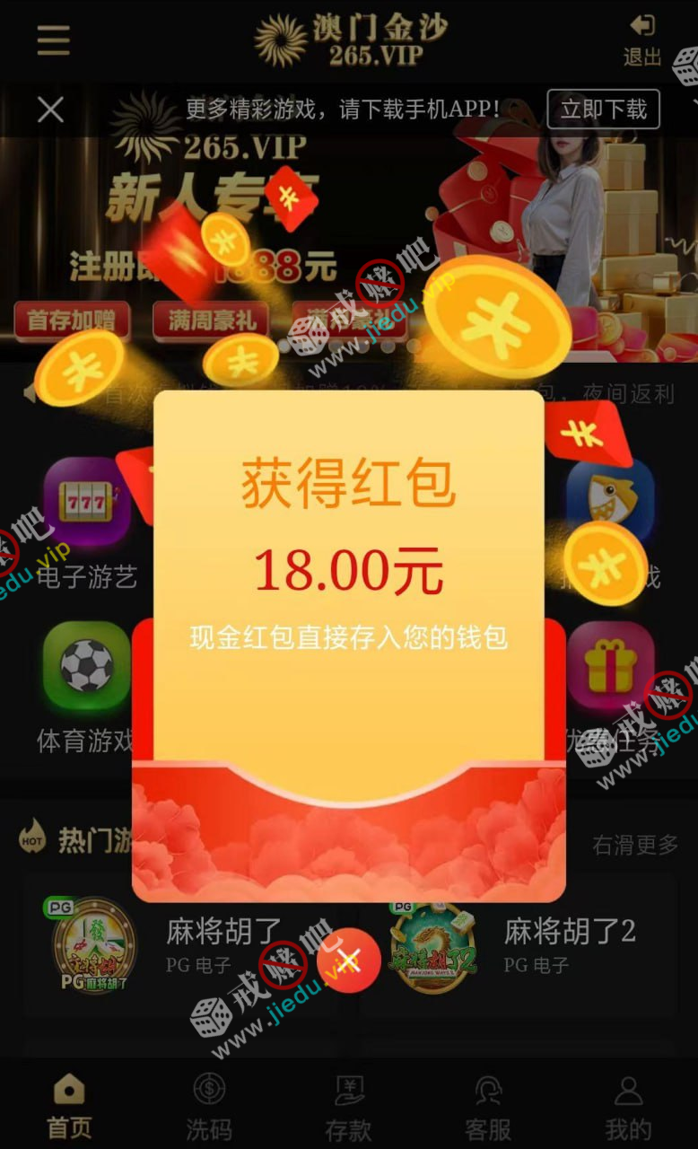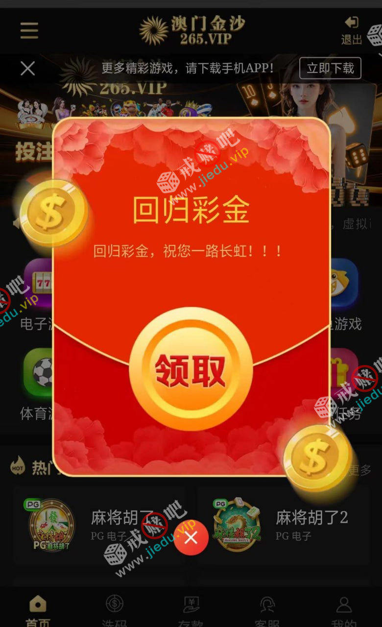 接到电话送18回归彩金没打出来,看看有没有,碰一下。