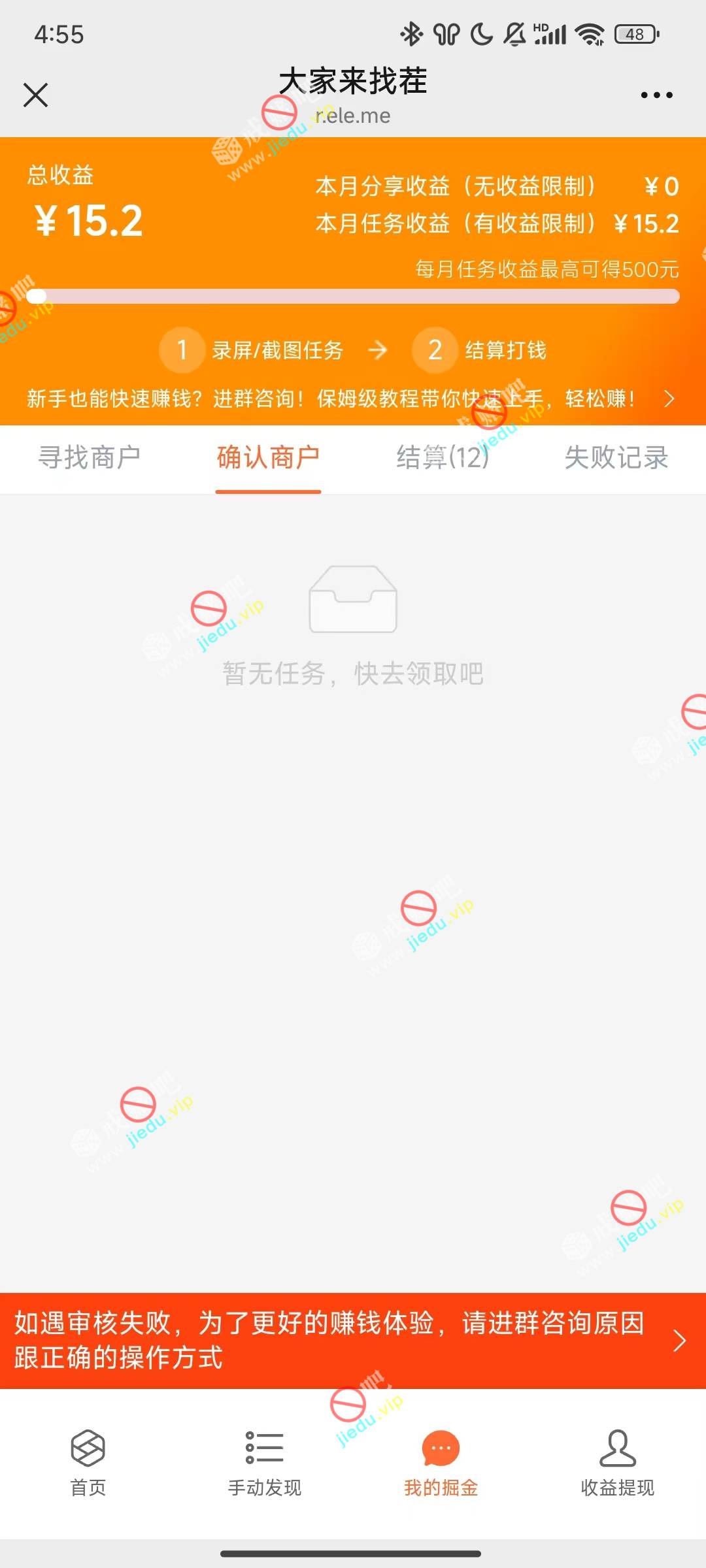 饿了么出的活动,简单录屏外卖软件一个1.2。一天做一轮就行,不然容易黑号。提现是直接到饿了么零钱,可以提现银行卡也可以直接饿了么点外卖吃。给挂逼的兄弟们一顿小馒头还是可以的,到饿了么首页下面点我的掘金-录屏/截图任务