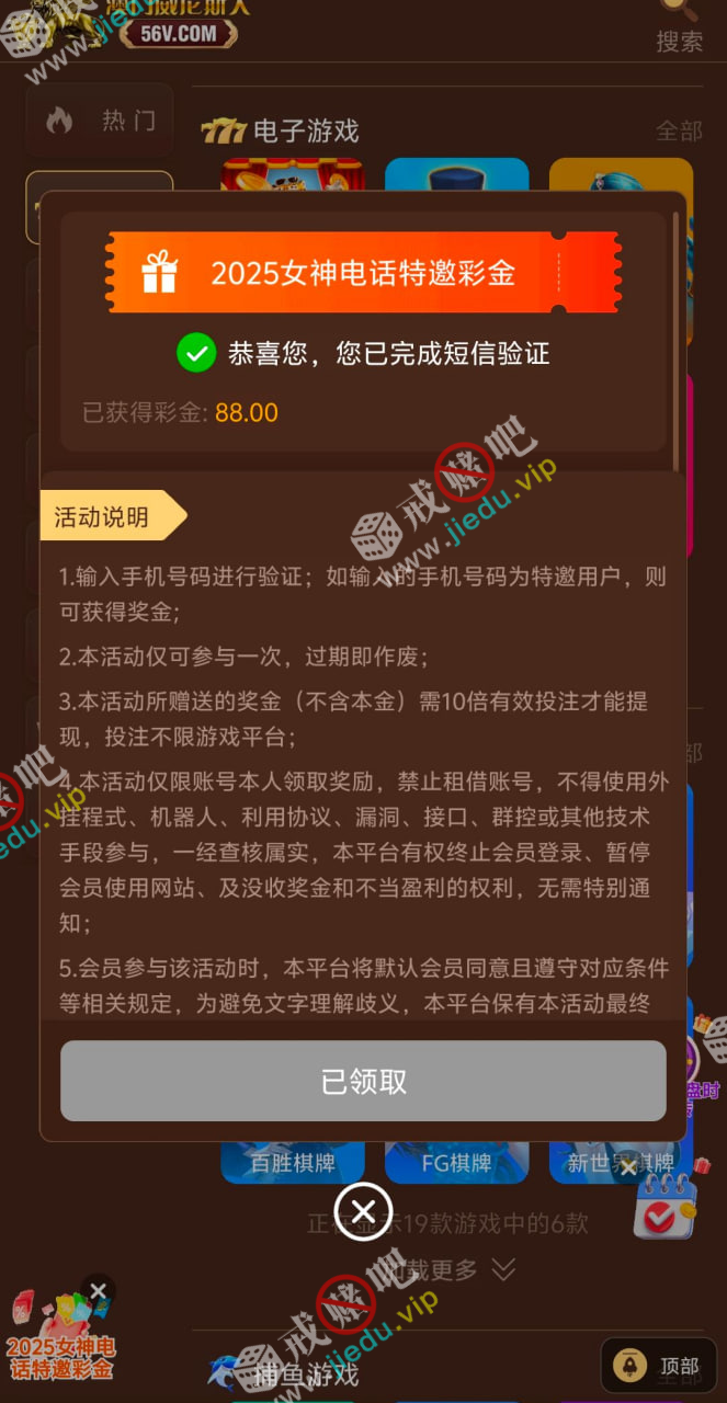 特邀送彩金88,输入手机号码,特邀领取88需要10倍流水,游戏不限制!