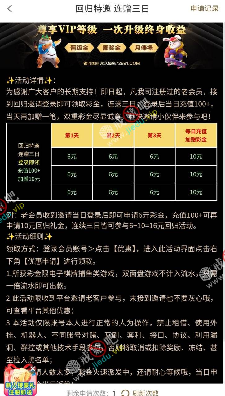 回归自助申请,连续送 3 天的,可以去看看。