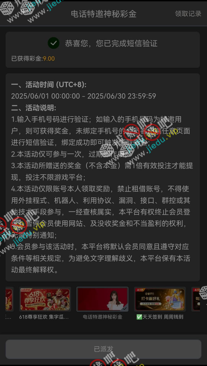 打电话来手机号注册上去就有9,兄弟们可以上号去看看。